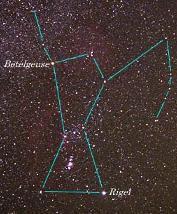 ギリシャのボイオティヤと言うところに、体の大きい美しい青年狩人がいました、これがオリオンです。月の女神アルテミスが、オリオンの腕前を認め自分の部下にし、地中海のクレタ島に連れて行きました。後にアルテミスはオリオンに求婚されますが、身分の違うオリオンと結婚するのがいやで、大地の女神ガイアにたのみ、サソリの毒をもって殺しました。また曙の女神エオス(オーロラ)がオリオンに恋したのを女神アルテミスが妬んでサソリを送り、殺したとも言われています。ゼウスは美しい狩人オリオンを惜しんで星座にあげました。星座になっても蠍座が東の空に昇る頃、今でもオリオンは西の空を逃げるように沈んで行きます。 |